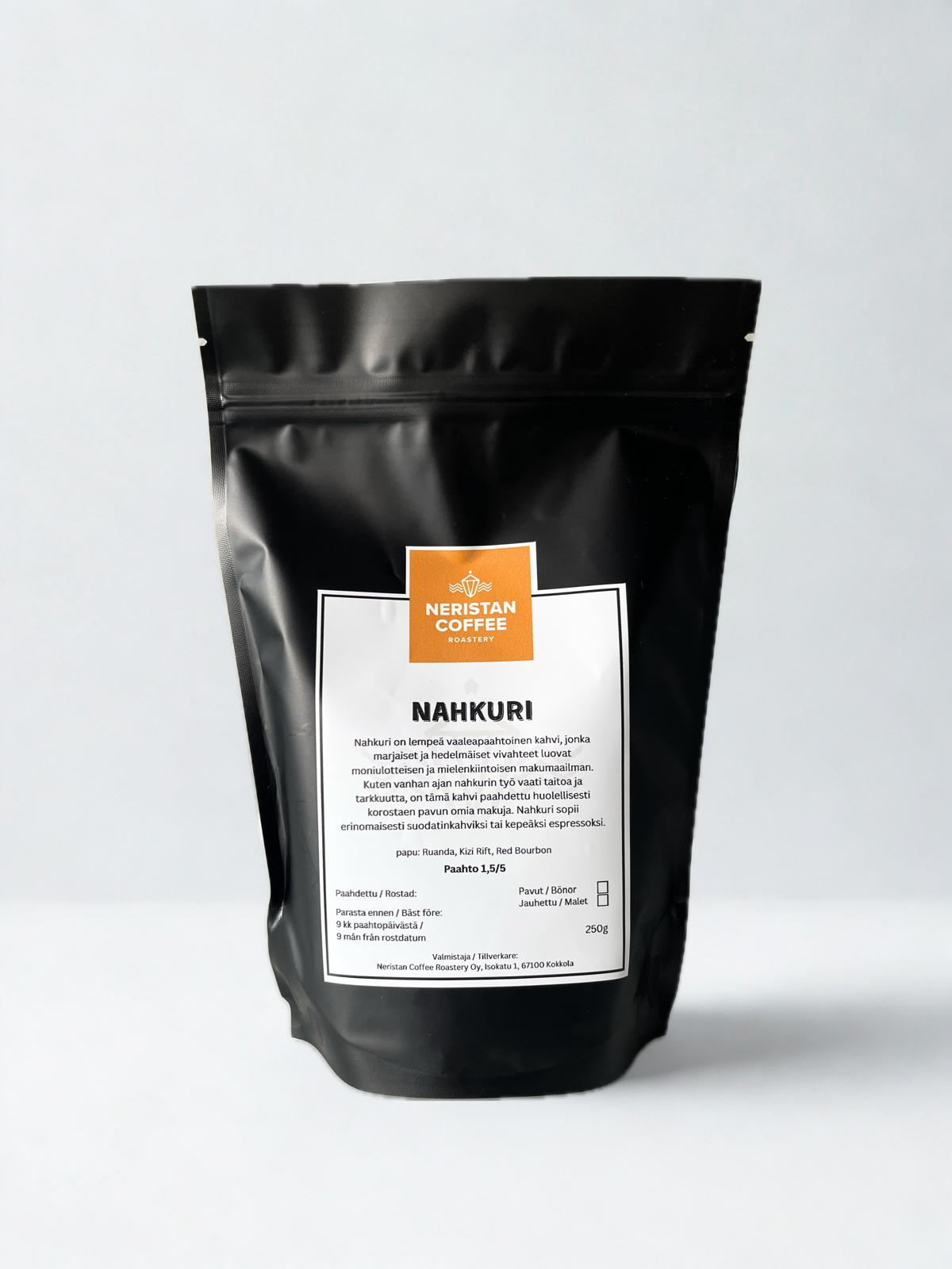 Nahkuri on lempeä vaaleapaahtoinen kahvi, jonka marjaiset ja hedelmäiset vivahteet luovat moniulotteisen ja mielenkiintoisen makumaailman. Kuten vanhan ajan nahkurin työ vaati taitoa ja tarkkuutta on tämä kahvi paahdettu huolellisesti korostaen pavun omia makuja.