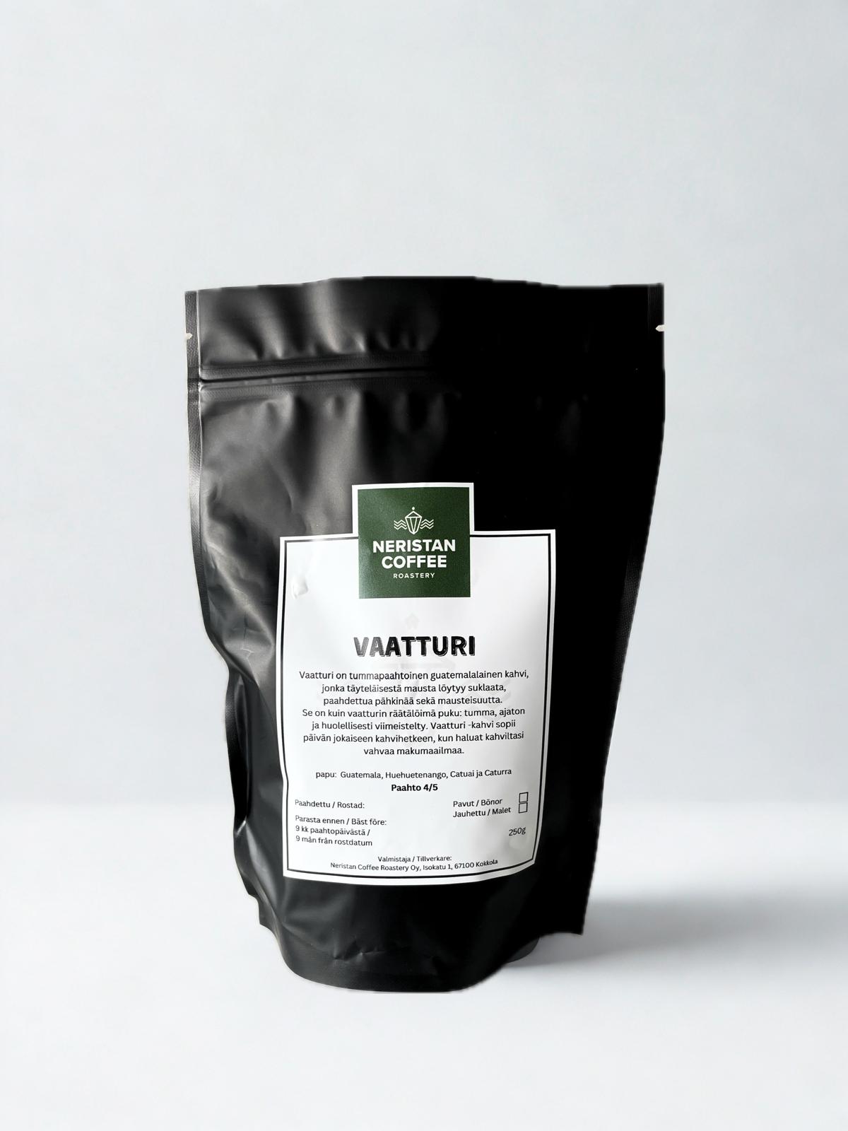 Vaatturi on tummapaahtoinen guatemalalainen kahvi, jonka täyteläisestä mausta löytyy suklaata paahdettua pähkinää sekä mausteisuutta. Se on kuin vaatturin räätälöimä puku tumma, ajaton ja huolellisesti viimeistelty.